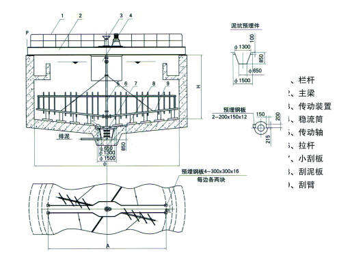 濃縮機(jī)由中心傳動(dòng)裝置驅(qū)動(dòng)傳動(dòng)軸、刮臂等旋轉(zhuǎn),刮臂上的刮板將污泥由池邊逐漸刮至池中心的泥坑中,通過(guò)排泥管排出池外;刮臂上固定有攪拌柵條,旋轉(zhuǎn)時(shí)對(duì)污泥攪動(dòng)使水和氣體外溢,提供絮狀污泥的沉淀空間,加速污泥的下沉,提高濃縮效果。