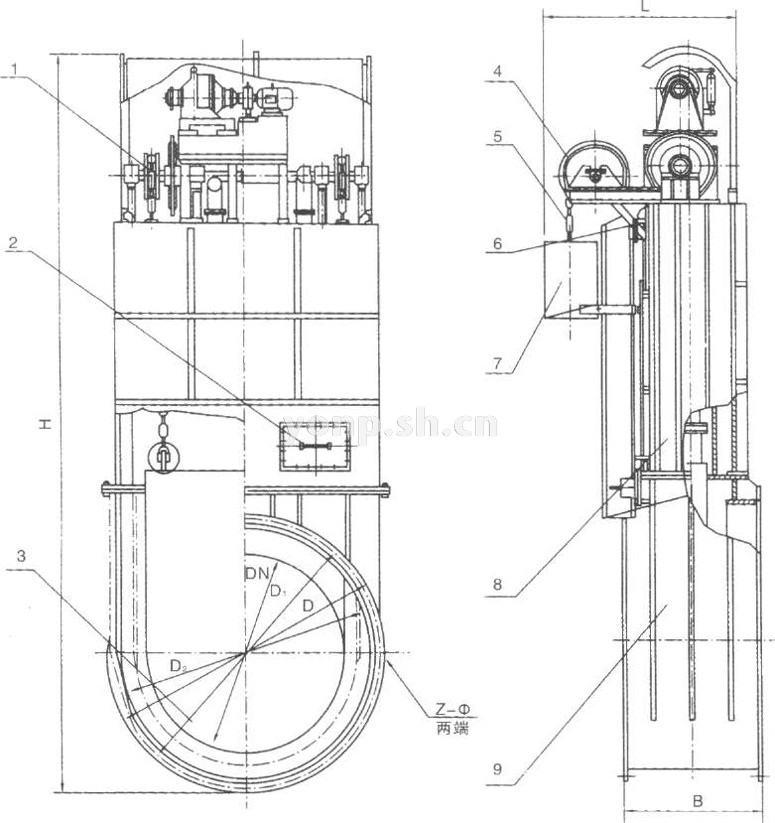 1、傳動(dòng)組件 2、檢修門蓋3、閥板 4、滑板 5、起重用短環(huán)鏈6、行程開關(guān) 7、配重箱組件 8、閥體(一) 9、閥體(二)